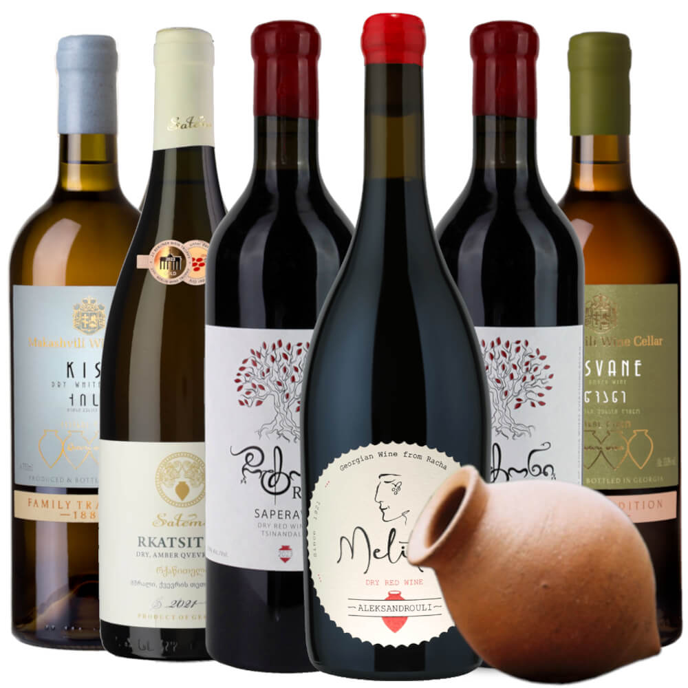 Diese sorgfältig zusammengestellte Auswahl vereint sechs herausragende Qvevri-Weine aus verschiedenen Regionen Georgiens – darunter Kachetien, Kartli und Racha-Lechkhumi. Jeder Wein wird nach der jahrtausendealten georgischen Methode in Tonamphoren (Qvevri) vergoren und gereift. Die Weingüter arbeiten mit autochthonen Rebsorten und verzichten auf Filtration und Zusatzstoffe – für ein unverfälschtes, naturbelassenes Geschmackserlebnis.